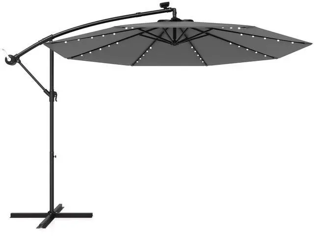 Instruction Description: Comes with 40 lamp beads and each rib features 5 provide beautiful lightingThe solar panel provides illumination for up to 7 hours when fully chargedWith its large shading area create a cool and comfortable outdoor retreatThe adjustable tilt function allows you to easily customize the shade angle from 0-35°Easy to tilt: loosen the locking handle and then move the handle up and downMade of high-quality polyester fabric fade-resistant wear and tear-resistant durableDesigned with a vented top for air circulation and stability even on windy daysDesigned with a convenient crank handle for easy opening and closingThe loop strap provides a secure fastening option when the umbrella is not in use8 heavy-duty metal ribs ensure unparalleled stability and sturdinessFeatures reinforced rib pockets help resist tearing or rib damageThe thick metal pole is rustproof and can withstand outdoor bad elementsPackage includeing 1 Offset Umbrella 1 Cross Base 1 Instruction