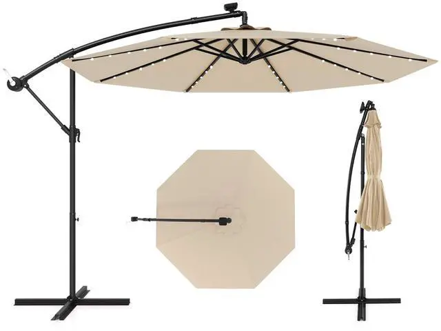 Instruction Description: Comes with 40 lamp beads and each rib features 5 provide beautiful lightingThe solar panel provides illumination for up to 7 hours when fully chargedWith its large shading area create a cool and comfortable outdoor retreatThe adjustable tilt function allows you to easily customize the shade angle from 0-35°Easy to tilt: loosen the locking handle and then move the handle up and downMade of high-quality polyester fabric fade-resistant wear and tear-resistant durableDesigned with a vented top for air circulation and stability even on windy daysDesigned with a convenient crank handle for easy opening and closingThe loop strap provides a secure fastening option when the umbrella is not in use8 heavy-duty metal ribs ensure unparalleled stability and sturdinessFeatures reinforced rib pockets help resist tearing or rib damageThe thick metal pole is rustproof and can withstand outdoor bad elementsPackage includeing 1 Offset Umbrella 1 Cross Base 1 Instruction