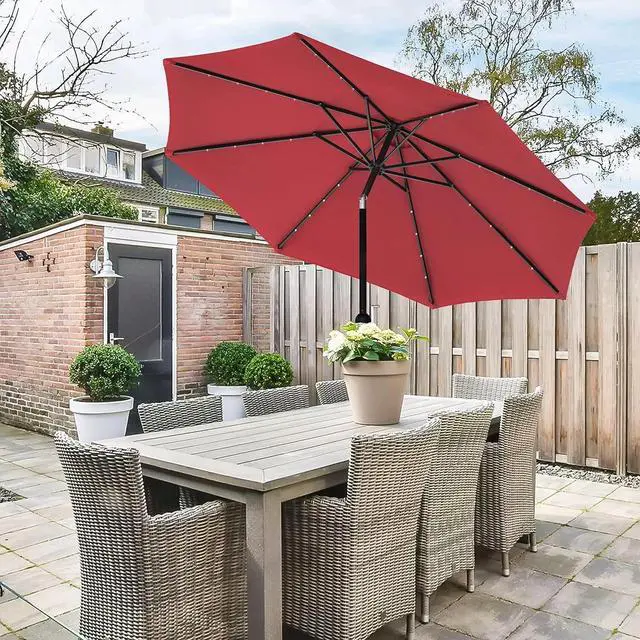 Our 9' LED lighted Umbrella is perfect for a 42"- 54" table with 4 to 6 chairs, is a perfect and essential for summer or sunny day, add a festive mood to any occasion, apply to yards, beaches, gardens, patios, cafe, pools, picnics, BBQ's