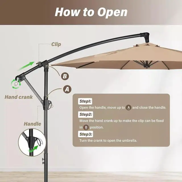 The elegant and innovative crank technology allows you to adjust angle of the umbrella to the moving sun. Easily Rotating the crank to open or close the umbrella. The elegant curved pole design also adds extra the beauty to your garden
