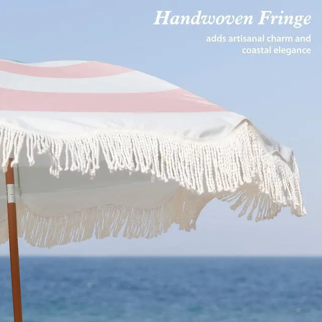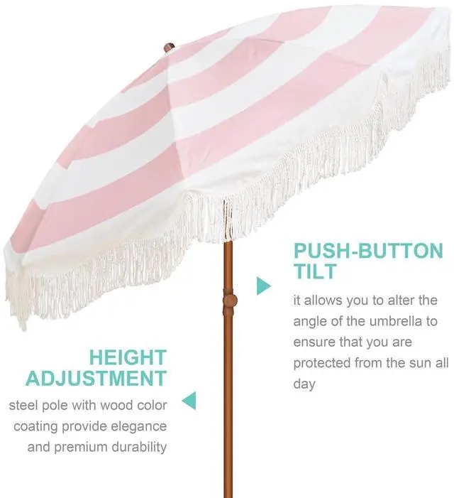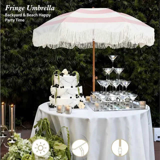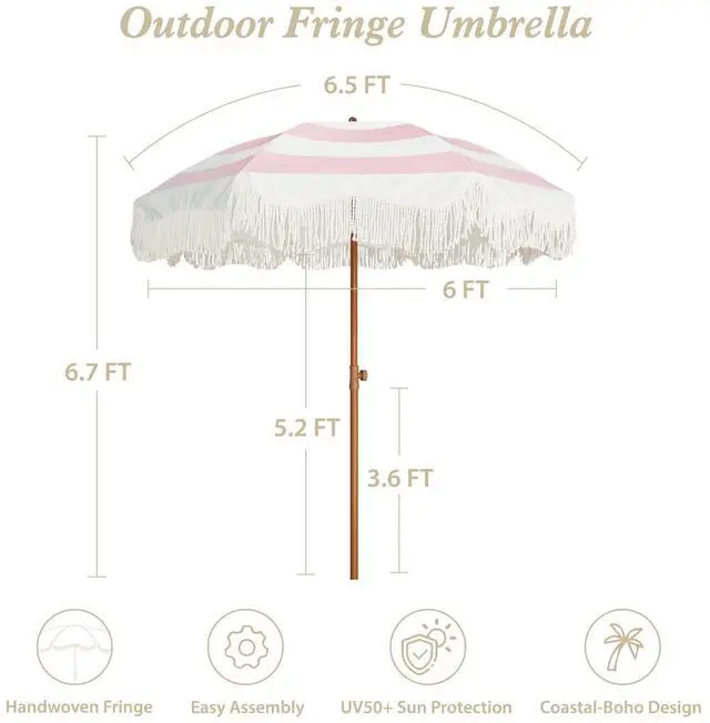 Boho Outdoor Umbrella with Tassels, 6.5ft Fringe Patio Umbrella, UPF50+ Picnic Umbrella Outdoor Patio with Steel Pole and Push Button Tilt, use it for picnic, party, and other leisure time.