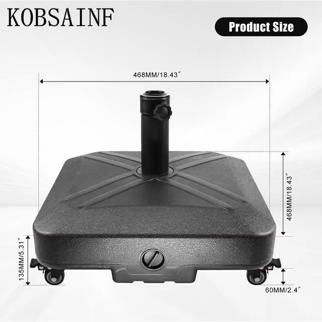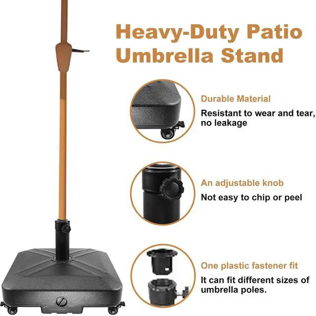 Rust Proof and Anti-corrosion MaterialThe materials used in this umbrella base are rust-proof and resistant to corrosion. It is made of durable HDPE (high-density polyethylene) material, ensuring its ability to withstand various weather conditions. The steel pipe incorporated into the design further enhances its solidity, preventing the outdoor patio umbrella from tilting easily. Overall, this umbrella base is built to be durable and reliable.