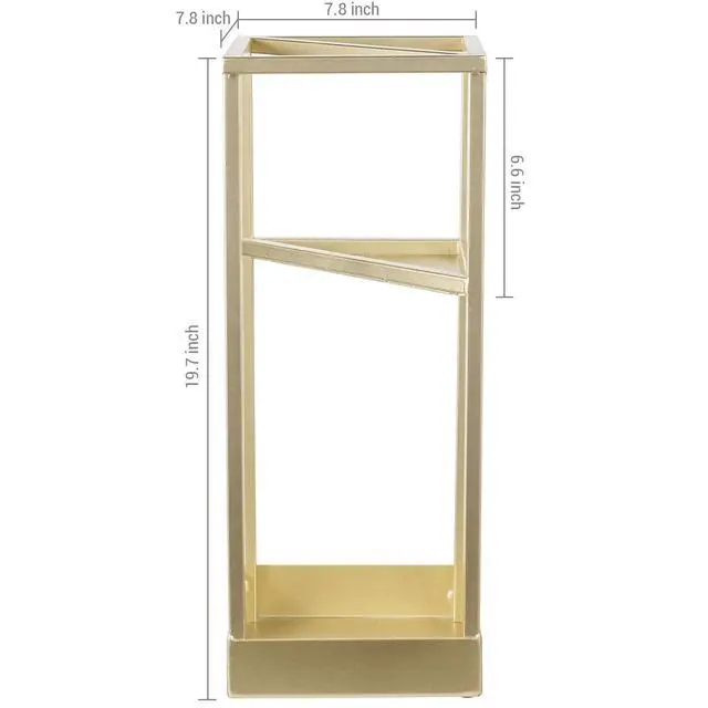 Place aesthetic décor by entrances that doubles as functional storage with this freestanding modern minimalist umbrella stand in a brass-toned metal geometric design. This 20-inch-tall basket is perfect for holding long umbrellas, parasols, canes and walking sticks, or hiking poles, keeping them upright and securely stored. Featuring a built-in triangular shelf, half of this organizer bin holds smaller folding umbrellas with a shaft of at least 6.5 inches long when fully closed. A protective raise edge bottom tray on this lightweight, floor standing umbrella holder protects surfaces from dripping wet umbrellas by preventing leaks water and pools. The space-saving slim design has a minimal footprint to keep spaces open while minimizing clutter, making this umbrella stand an ideal storage solution for entryways, mudrooms, or covered patios. Keep umbrellas conveniently stored for quick access at entry points in a home, office, or business settings for when those rainy days strike, or parasols handy for everyday sun protection in this multipurpose brass-toned metal decorative grabber that makes an excellent gift for anyone.