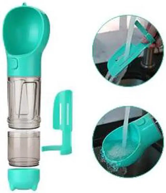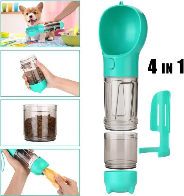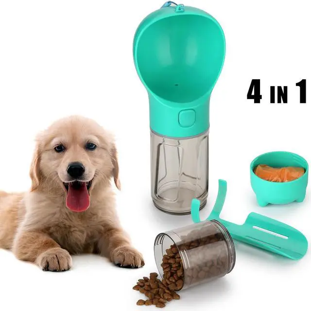 Multifunctional Portable Pet Water Bottle: This Multifunctional water bottle integrates water bottle, dog food storage, dog waste bag and excrement scoop all in one item.