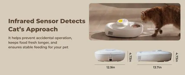 Equipped with a high-sensitivity infrared sensor, the feeder detects your cat within a 30mm range and 40° angle, automatically opening the lid for easy access. It creates a more natural feeding experience that aligns with your cats instincts, keeping them engaged and comfortable.