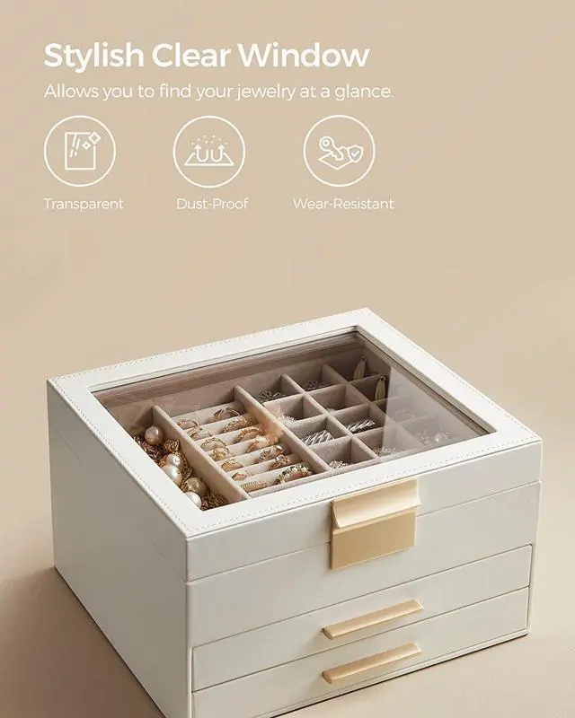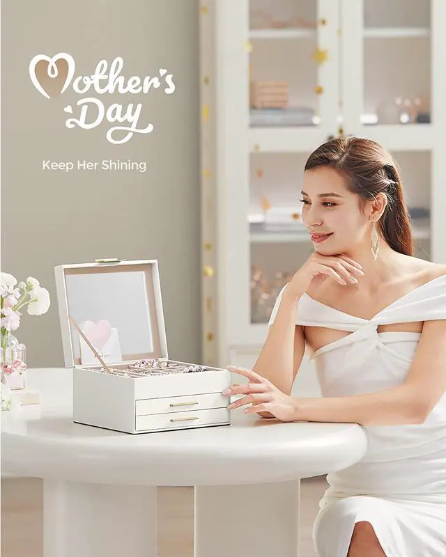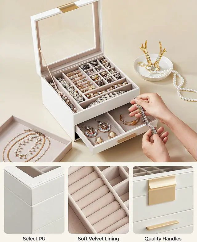 [Chic & Durable] Elegant cloud white color, shiny metal handles in a gold color, soft velvet lining, neat stitching, quality PU, and sturdy MDFall these elements combined make this jewelry box stylish and durable enough for your ever-growing jewelry collection