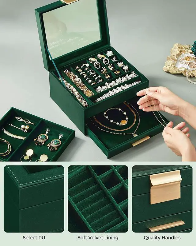Jewelry Box with Glass Lid, 3-Layer Jewelry Organizer, 2 Drawers, Jewelry Storage, Lots of Storage Space, Modern, Gift Idea, 8 x 9.1 x 5.3 Inches, Cloud White and Gold Color UJBC239WT Green