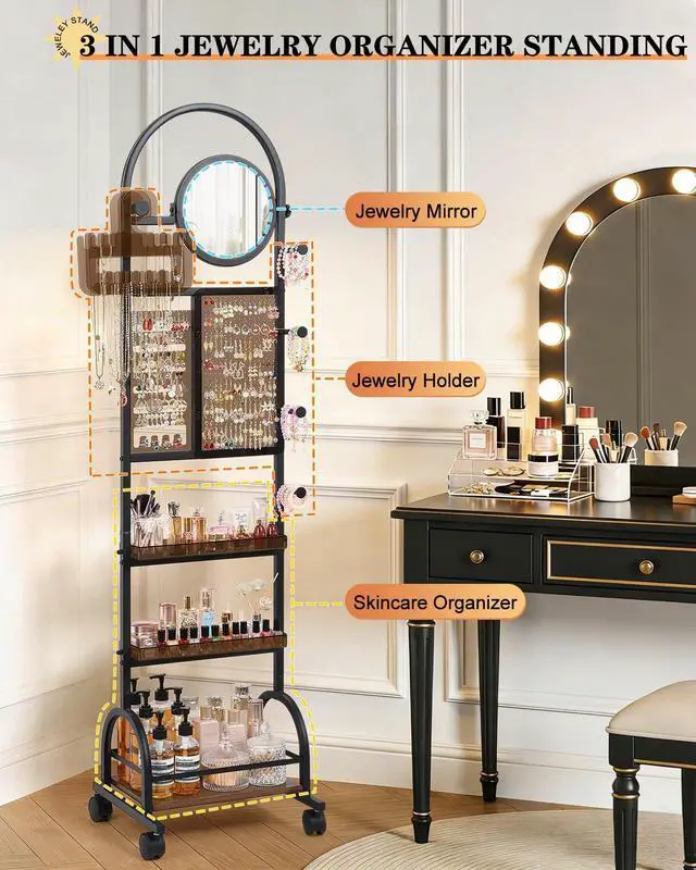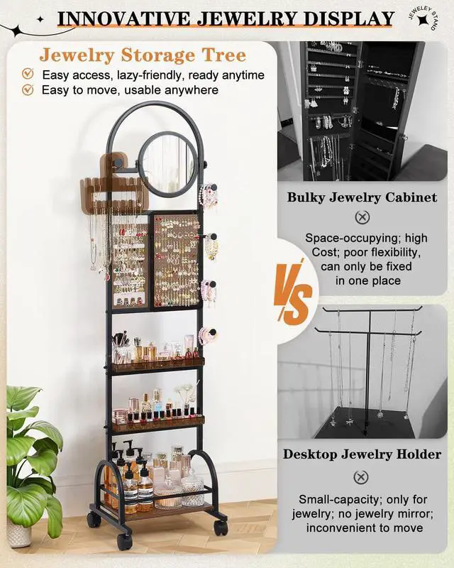 Designed as a modern alternative to traditional jewelry cabinets, this newly upgraded freestanding big tall jewelry holder brings together elegance, capacity, and convenience in one refined vertical design. Combining a high-definition round makeup mirror, comprehensive jewelry display, and visible beauty storage, it creates a dedicated dressing station where everything is within reach. With open-access storage and a slim footprint, the rack-style jewelry mirror cabinet delivers the same large capacity as a jewelry armoirewithout the bulk, heavy doors, or hidden compartmentsallowing you to select, match, and style your accessories directly in front of the mirror with ease.