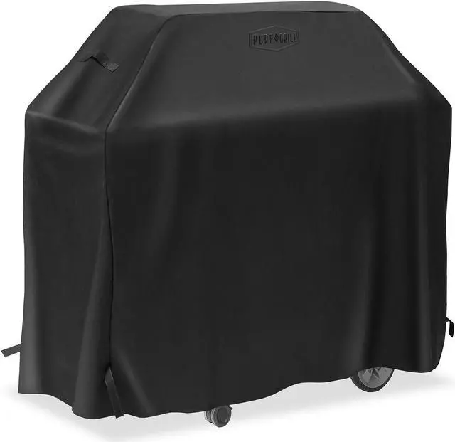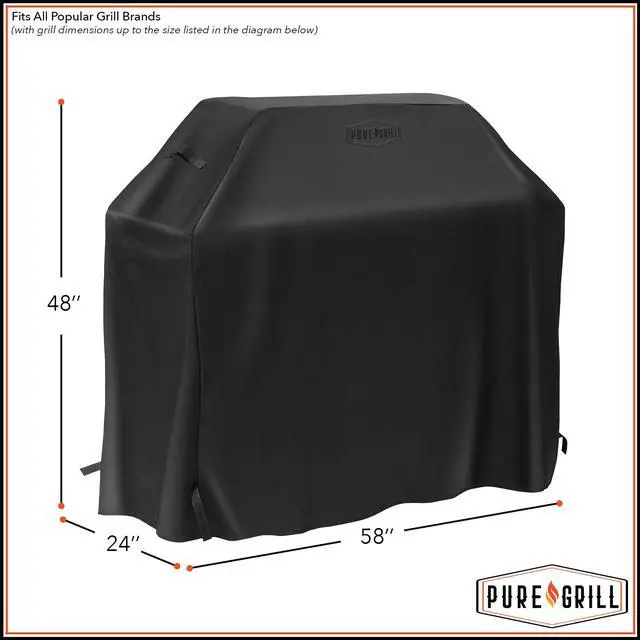 The superior craftsmanship of Pure Grill's BBQ grill cover offers strength and outstanding weather resistance to protect your barbecue grill. This premium universal grill cover measures 58" Wide x 24" Front to Back x 48" High and will fit all popular grill brands with 3 or 4 burners and measuring 50-58 inches wide. Be sure to measure your BBQ grill for proper fit. Convenient handles allow for easy fitting and removal of the grill cover.