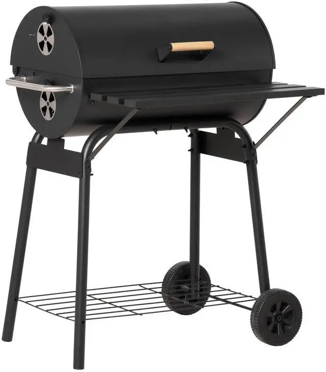 • 30" Portable Barrel Charcoal BBQ Grill, Steel Outdoor Barbecue Smoker with Storage Shelf, Wheels for Garden Camping Picnic, Black