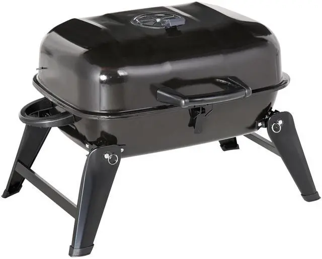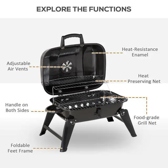 • 14" Portable Charcoal Grill, Tabletop Small BBQ Grill for Outdoor Cooking, Camping, Tailgating, Enamel Coated, Vent, Folding Legs, Black