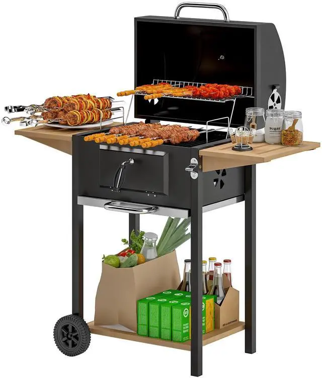 • Charcoal BBQ Grill with 245 sq. in. Cooking Area, Outdoor Barbecue Grill with Adjustable Charcoal Pan, 3 Shelves, Thermometer, Wheels, Black