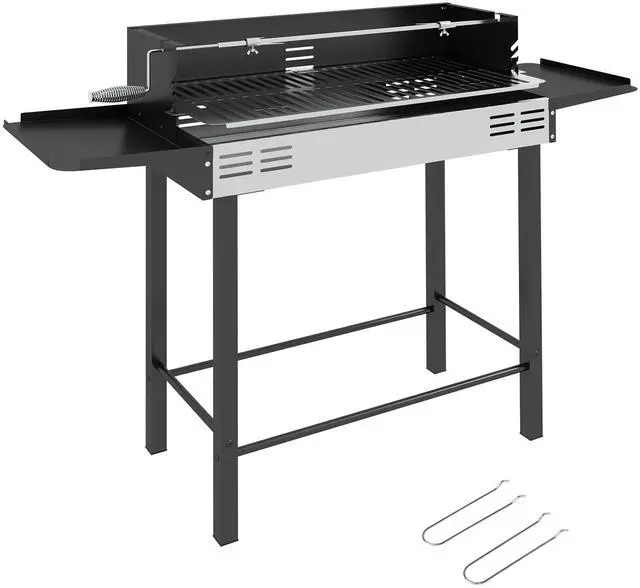 BBQ Rotisserie Grill Roaster, Charcoal Split Roaster for Chicken or Turkey with 3-Level Grill Grate, Foldable Storage Shelves, and Wind Deflector, Stainless Steel, Black