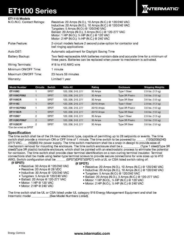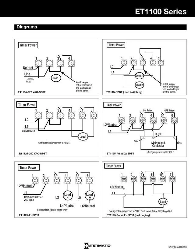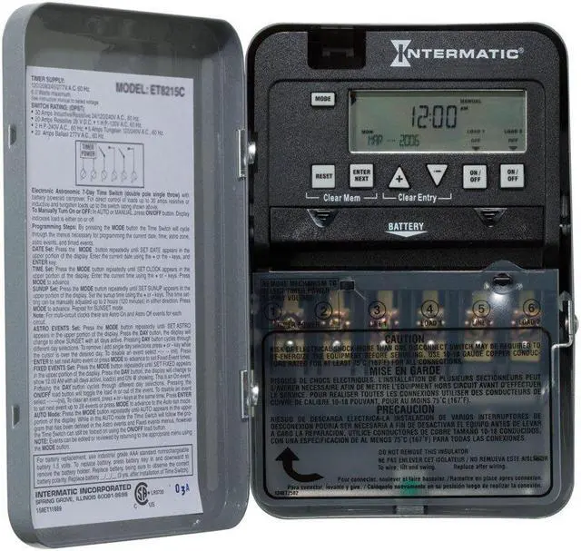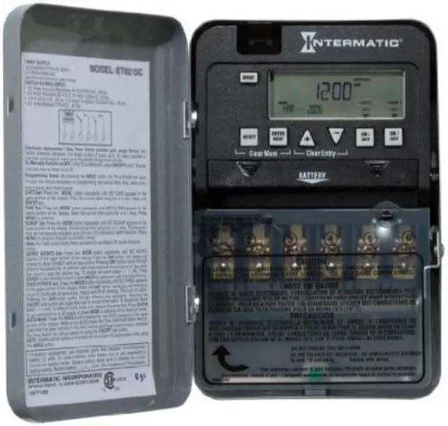 The Intermatic ET1125C Electronic 24 Hour Timer Switch is a great daily timer that supports up to 14 on and 14 off events per day. ET1125C automatically loads the preset events within the daily schedule with to the minute accuracy. It can be used as an on/off timer in applications requiring 24 hour load control such as pumps, air conditioning systems, lighting, etc. The ET1125C also has a manual on/off override switch. It is designed to directly switch tungsten or ballast loads within its rating, and inductive loads or resistive loads up to 30A at 120, 208, 240 or 277 VAC.