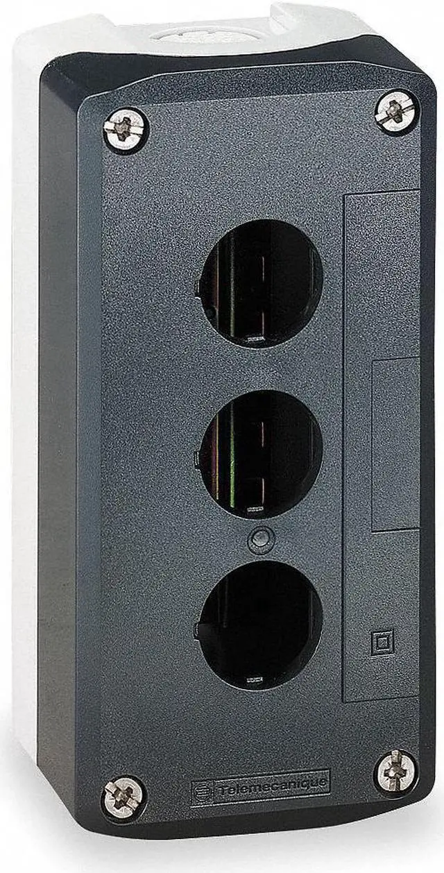 Push Button Enclosure, Number of Columns 1, Number of Holes 3, NEMA Rating 1, 12, 13, 4X, Conduit Size 1/2 in, Dimensions 5.27 in H x 2.68 in W x 2.00 in D, Hole Size 22 mm, Material Polycarbonate, Height 5.27 in, Width 2.68 in, Depth 2 in, Color Gray, For Use With ZB5A Operators and Plastic 22mm Pushbutton or Pilot Light Head, Standards RoHS. This item has been restricted from sale in the following state (s): []