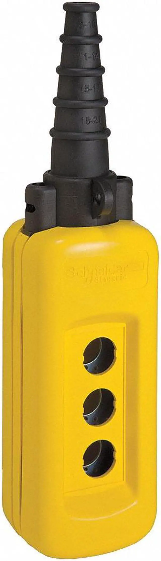 Pendant Enclosure, Number of Holes 3, Cable Entry 0.31 in to 1.02 in, NEMA Rating 1, 12, 2, 3, 3R, 4, 4X, Color Yellow, Hole Size 22 mm, Material Plastic, Height 12.36 in, Width 3.15 in, Includes Cable Sleeve, For Use With Mfr. No. ZB2BY2101, Standards CSA, EN/IEC, IP65, RoHS, UL Listed. This item has been restricted from sale in the following state (s): []