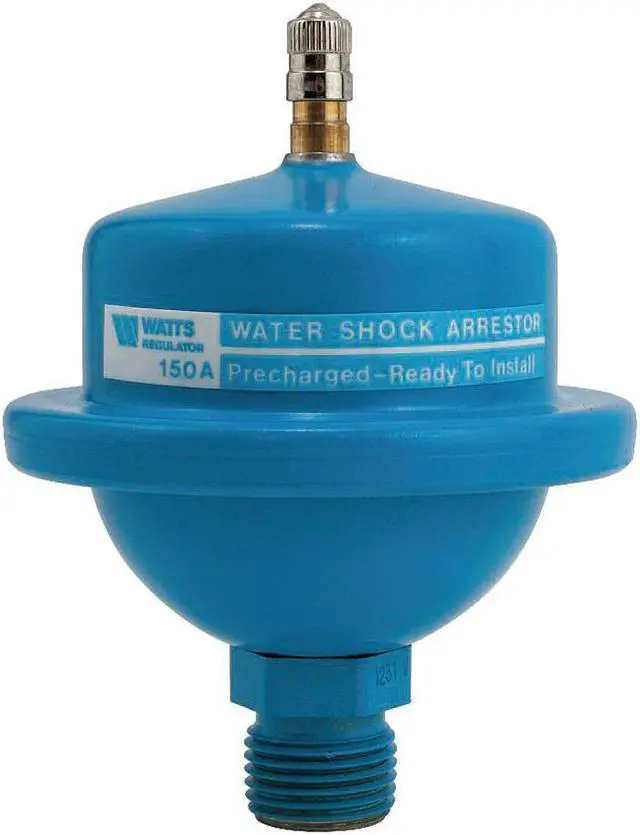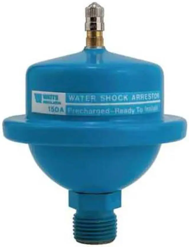 Water Hammer Arrestor, Body Material Brass, Stainless Steel, Connection Type MNPT, Pipe Size 1/2 in, Factory Set Pressure 30 psi, Overall Height 4 5/16 in, Diameter 4 13/32 in, Max. Pressure 150 psi, Temp. Range 33 Degrees to 180 Degrees F. This item has been restricted from sale in the following state (s): []