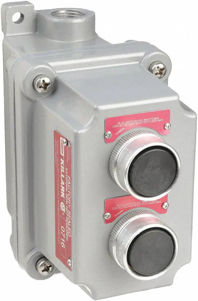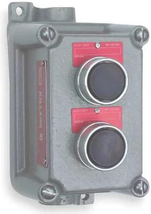 Control Station, Number of Operators 2, Number of Pilot Lights 0, Legend No Legend, Type of Operator Push Button, Action Momentary/Momentary, Operator Color Black, Contact Form 2NO/2NC, NEMA Rating 7, 9, Contact Rating 10A @ 600V AC, 2.5A @ 250V DC, NEMA Contact Rating Designation A600/Q300, IP Rating Not Rated, Mounting Surface, Height 6.81 in, Width 3.6875 in, Depth 5.344 in, Enclosure Material Aluminum, Enclosure Color Gray, Standards CSA LR11714, UL E12379, UL E53360. This item has been restricted from sale in the following state (s): []