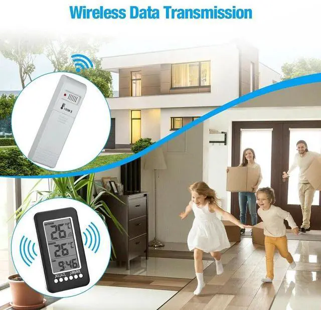 Digital Thermometer Clock Indoor/Outdoor Wireless Temperature Transmitter Meter