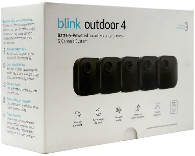 2x Blink Outdoor 4 Wireless Smart Security Camera - 5 Camera System (4th Gen.) Blink Outdoor 4 Wireless smart security camera - 5 camera systemHelp protect what matters most - better than ever - with Blinks fourth generation of wire-free Outdoor smart security cameras. Outdoor 4 is innovative yet easy to use with up to two years of powerful battery life. Affordable peace of mind starts here.