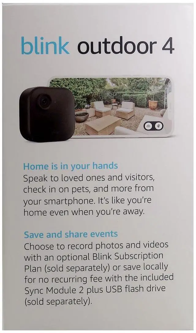 - Save and share clips Securely store your footage in the cloud with a free 30-day trial of a Blink Subscription Plan. You can also back it up locally with your included Sync Module 2 and a USB drive (sold separately).