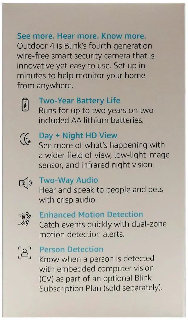 - Person detection Get alerts when a person is detected with embedded computer vision (CV) as part of an optional Blink Subscription Plan (sold separately).