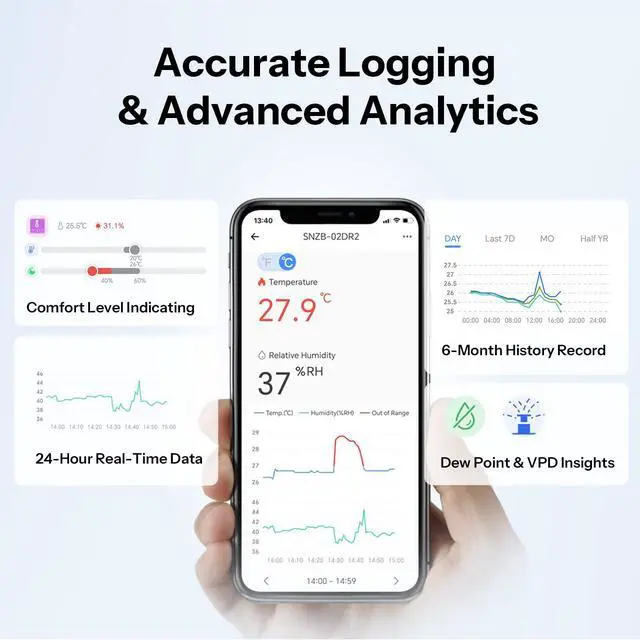 [Half-year History Record & Diverse Charts] View 6-month detailed records with maximum, minimum, and average curves across four time spans daily, weekly, monthly, and half-year. The device also provides dew point and VPD insights. All history record can be exported for free.