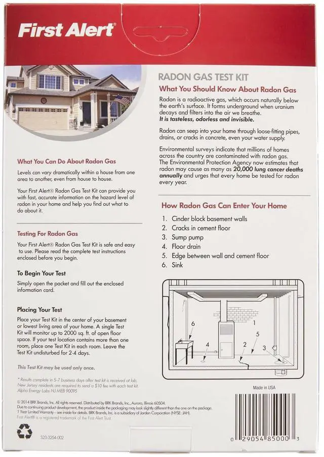 The First Alert RD1 Radon Gas Test Kit easily and safely allows you to check your home, work, or other spaces for dangerous radon gas. Radon is a colorless, odorless gas that is the leading cause of lung cancer in non-smokers. This radon testing kit is an easy and inexpensive way to determine if radon is present and is ideal for disaster preparedness. It is recommended for use only within the United States.