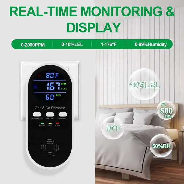5-in-1 Explosive Gas and Carbon Monoxide Detector: Plug-and-play operation with real-time display of CO, natural gas, temperature, and humidity.