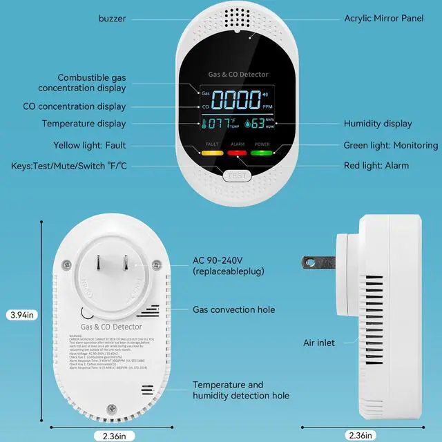 [4-in-1 Monitoring and Protection Detector]This advanced 4 in 1 carbon monoxide detector and natural gas leak detector combines sensors for carbon monoxide, natural gas, temperature, and humidity. With its robust performance,it offers all-around protection to ensure the safety of your household.This carbon monoxide and gas alarm detectors has been rigorously tested,and meet UL standards. The package includes:1x carbon monoxide and gas detectors,1 x User manual.You can enjoy unsatisfactory refund service!If you have any questions about this natural gas and carbon monoxide detector,please feel free to contact us.
