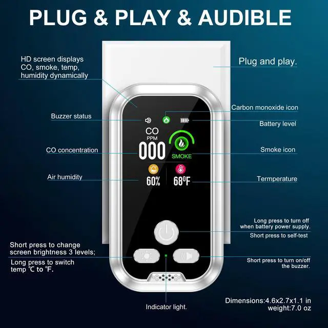 ![Alt view image 6 of 7 - 4in1 Plug in Smoke & Carbon Monoxide Detector Combination Builti-in 2000mAh Backup Battery HD Screen [Smoke CO Temp Humidity Sensor] for Home Hotel Travel (1 Pack, White)](https://c1.neweggimages.com/productimage/nb640/C5DWD2603160QPCJ1FF.jpg)