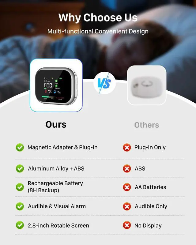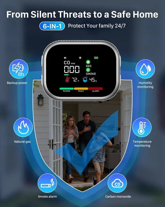 6-in-1 Advanced Protection: More Than a CO Alarm! Our natural gas detector monitors 5 critical dangers: CO, combustible gas, smoke, high humidity, & temperature spikes, all in one device. Plus, battery backup ensures continuous monitoring during blackouts. Its a comprehensive, all-in-one solution for modern home safety.