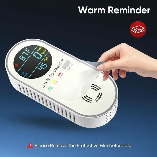 The 4-in-1 detector simultaneously detects natural gas and carbon monoxide, while also displaying temperature and humidity. This comprehensive functionality ensures the health and safety of you and your family, surpassing single-function detectors.