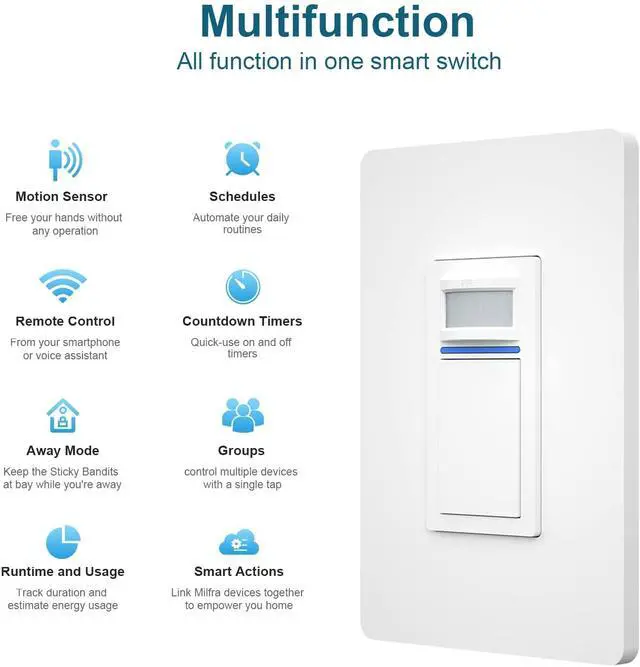 - Motion Sensor Switch :This is smart wi-fi light switch, built in a motion sensor, automatically turn on/off lights based on room PIR occupancy. NOTE: The sensor switch keeps staying off if the environment is bright.