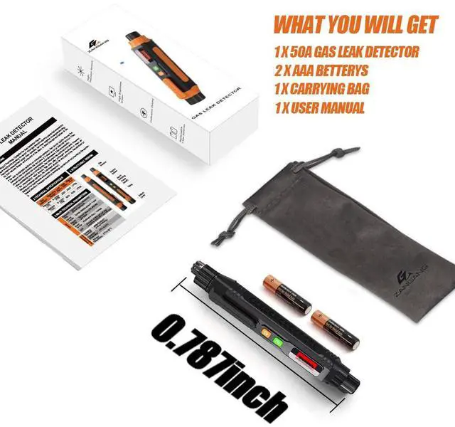 • What You'll Get : Gas Leak Detector X1, AAA Batteries X2, User Manual X1, Carrying Pouch X1.