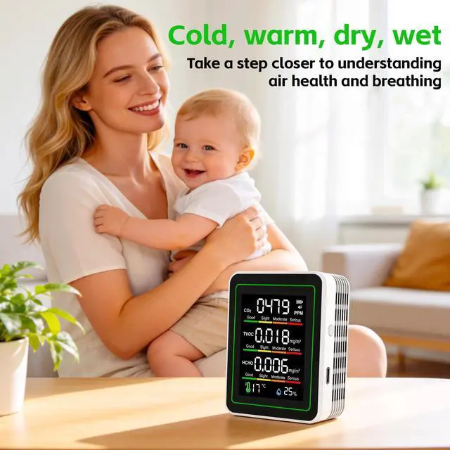 5-in-1 air quality monitor accurately detects CO2, HCHO (formaldehyde), TVOC, temperature and humidity in real time. Helps you quickly understand indoor air quality and protect your familys health.