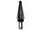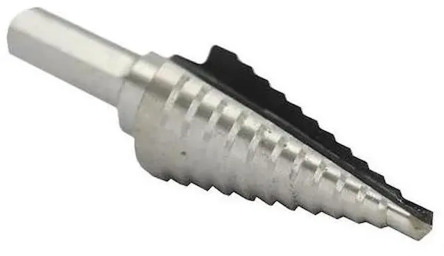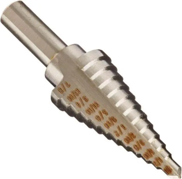 Step drills are the only drills you can sharpen yourself (both tip and flute). Exlusive single radial concave flute crates perfectly round holes in metal, plastic wood and other thin materials without center punching. Contructed of industrial grade high-speed molybdenum steel, heat-treated and temperature for long life. Slef-stating tip. No center punching needed. Automatically deburrs top side of hole. Ideal for steel, copper, aluminum and other thin meterials. Single flute cutting edge with sizes printed on each step 3 flatted shank Size #4, 3/16 to 7/8 by 1/16 Increments Drill up to 12 different size holes 3/8" Shank