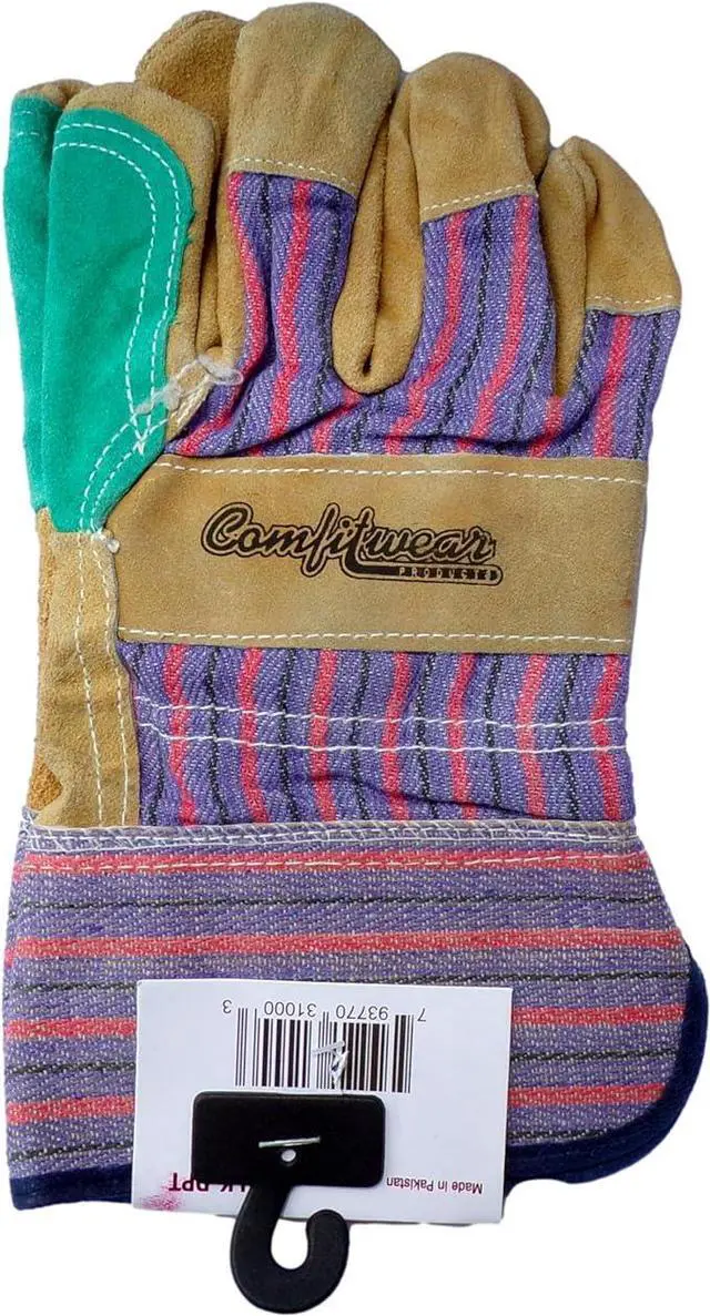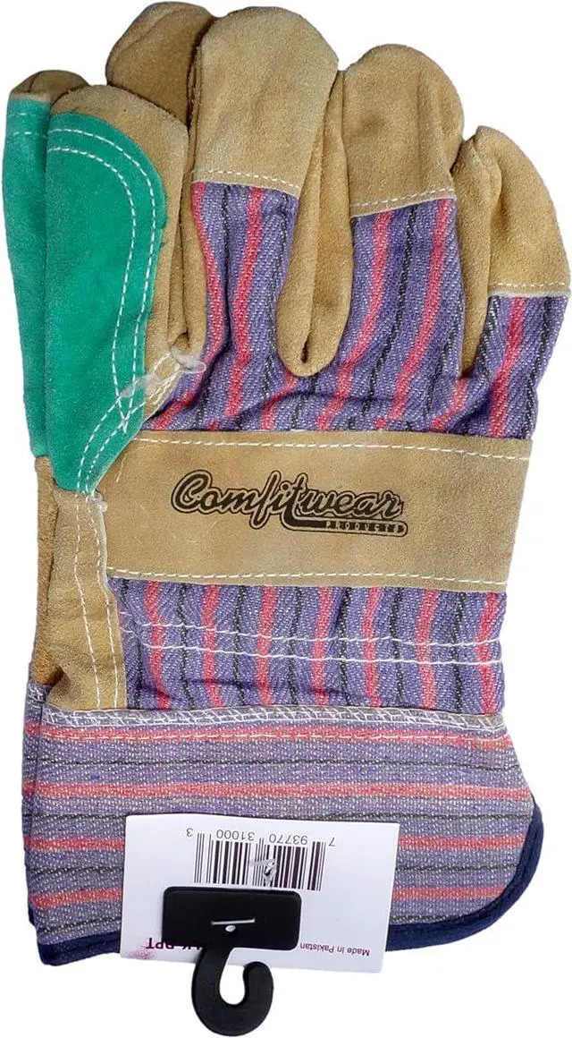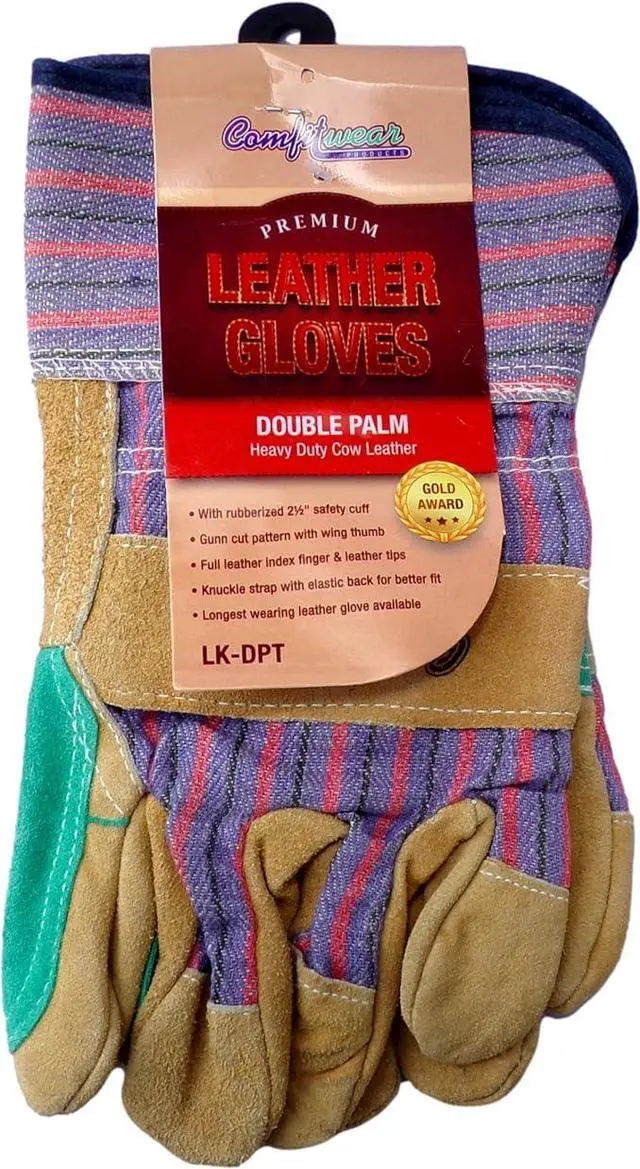 Tackle tough jobs with confidence using Double Palm Split Leather Gloves, built for strength, durability, and long-lasting wear. Featuring reinforced double palm construction, these gloves offer enhanced protection and abrasion resistance. The gloves are designed to fit comfortably on the hands, with a breathable back and a sturdy 2.5 -inch rubberized safety cuff that shields the wrist while ensuring a secure fit. With 12 pairs in each pack, they offer both performance and value for professionals and DIY users alike.
