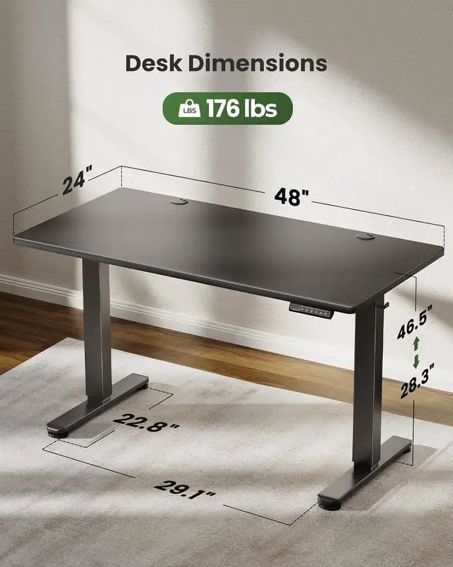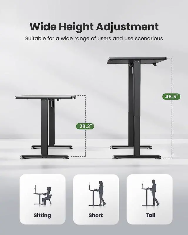 : This height adjustable desk has a lifting range of 28.3" 46.5" to meet the needs of different users and situations. The smooth lifting system with powerful motor enables quick & quiet ( <50db) standing desk height adjustment.