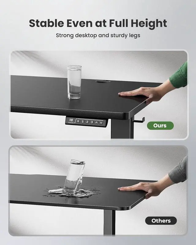 : The thick desktop of this stand up desk rests on a sturdy steel frame with T-shaped legs. Even at full height, this desk stands firm. Work more productively without distractions.