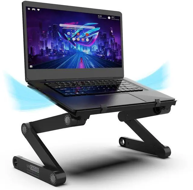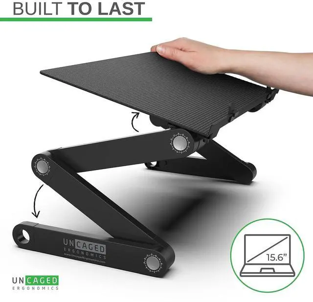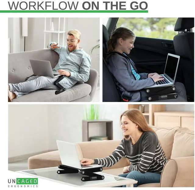 Work Better, Study Smarter, Relax Better. Tired of hunching over your laptop, struggling with discomfort and poor posture? Say hello to the ultimate desktop stand for laptops! It's time to take your workspace to the next level. This portable laptop desk positions screens at the perfect position for you. The adjustable computer stand raises and tilts screens. Plus the aluminum panel on this foldable laptop desk naturally dissipates heat to cool laptops. Not just a laptop stand for desk, this laptop holder works equally as well as a bed table for laptop or laptop desk for couch. Slip these lap desks for adults and kids over your lap or beside you and enjoy hands-free computing comfort. The laptop desk for bed gives you the freedom to move without upsetting your laptop, unlike those laptop pillow desks. This is the one lap top stand that works everywhere you do - as a laptop stand for desk adjustable height or a comfy laptop lap desk for bed and couch. Customize your screens height (anywhere from 2 to 18 inches) and tilt it up to 15 degrees with this laptop bed desk. That's right, find your sweet spot for a perfect view and bid farewell to neck and back strain. Upgrade your workday, boost productivity, and do it all in style! The Uncaged Ergonomics adjustable laptop stand for bed is a game-changer. It elevates heavy laptops or textbooks to eye-level, ensuring you study with comfort and ease. From binge-watching your favorite shows in bed to effortlessly holding books, iPads, and tablets, it's your go-to companion for productivity and relaxation. Compute more comfortably anywhere with this laptop cooler stand. Embrace a whole new level of productivity, comfort, and style with this laptop tray for bed and sofa. maximize productivity while staying comfortable with a laptop bed table. Your back and neck will thank you!