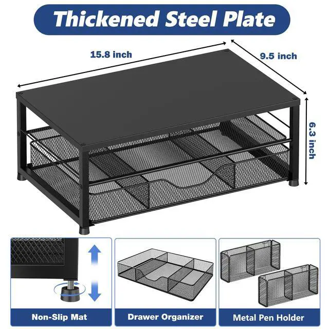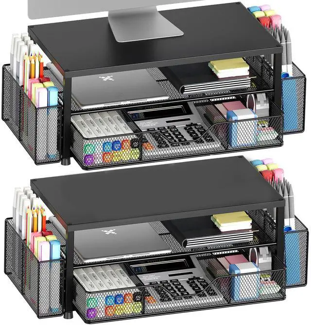 For those who value a neat and organized workspace, this 2-tier monitor stand with 2 hanging pen holders and 1 drawer provides ample storage for your office supplies and desk accessories, helping to keep them neatly categorized and easily accessible.