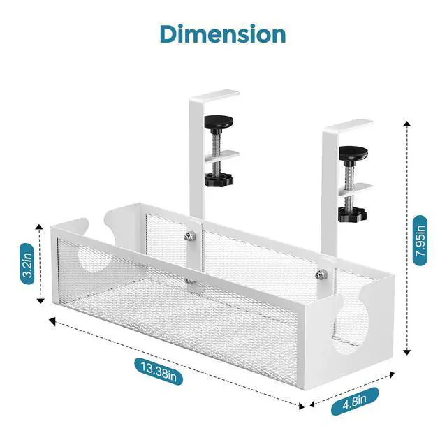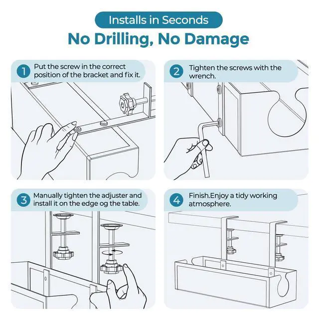 Say goodbye to complicated tools and desk damage. This under desk cable management tray features a rotating clamp design that installs securely without drilling or screws. Simply twist to adjust and tighten — it’s that easy. The non-invasive setup protects your desktop surface and is perfect for home offices, workspaces, and more. Quick to install, convenient to use.