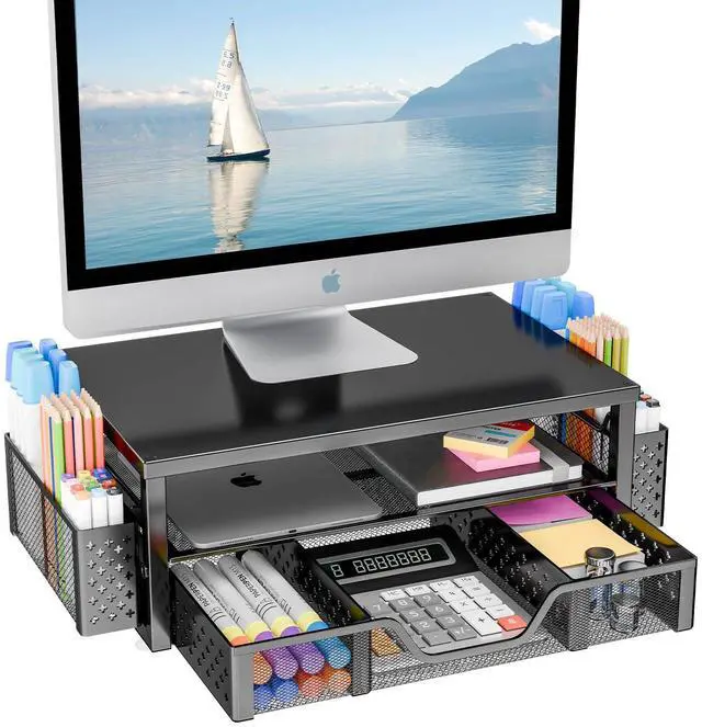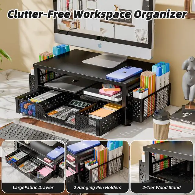 Desk Organizer and Accessories, 2-Tier Computer Monitor Stand Riser with Drawer and 2 Pen Holders for Office Supplies, Black