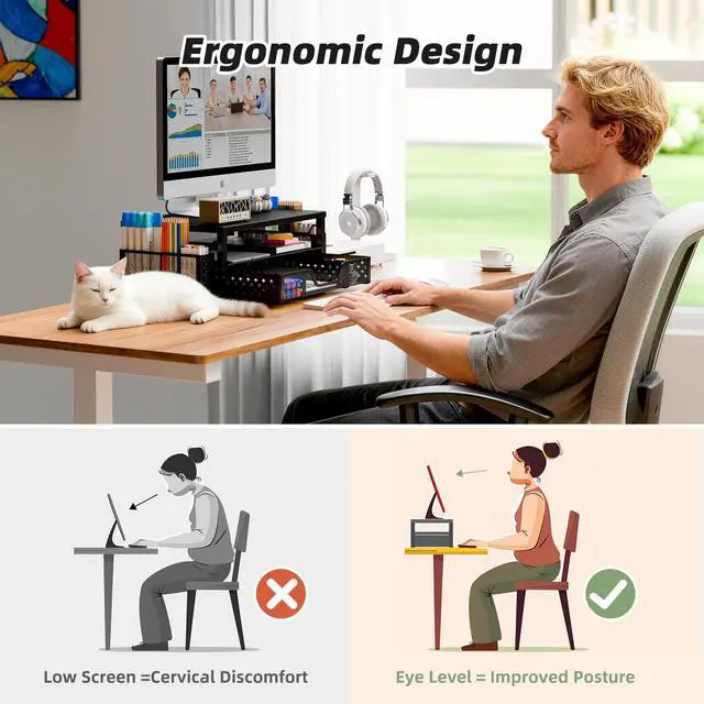 Ergonomic DesignThis computer stand elevates your monitor or laptop to a comfortable viewing height, effectively relieving neck and shoulder fatigue. It optimizes your workspace layout while enhancing comfort, making it an ideal choice.