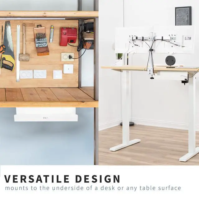 • Under Desk Mounting: Installs under any wood or particle board desktop with the provided screws (mounting holes are 11" apart). The partially closed design keeps cords and devices well hidden, while the front opening makes adding or removing cables easy