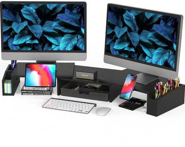 - Reduce neck/back strain by elevating your monitors while organizing your office supplies.