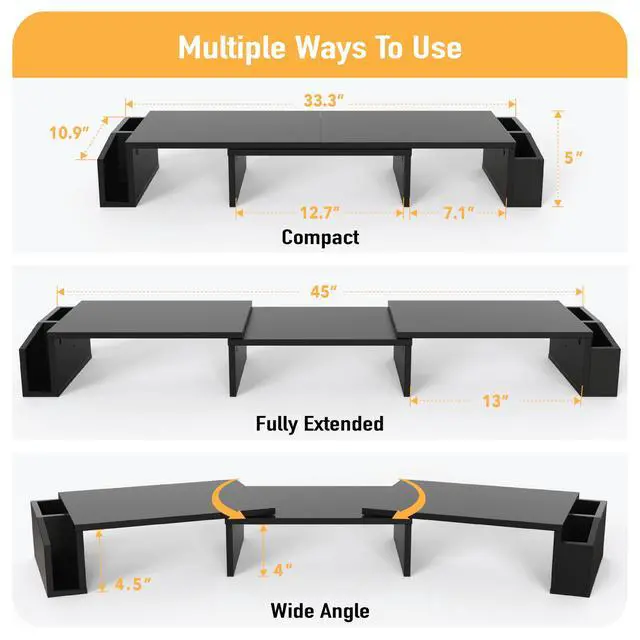The monitor stand can help elevate your monitor to a comfortable height for a better viewing angle and position. This elevation helps you to achieve the perfect eye-level viewing position in order to get rid of neck / back pain due to incorrect viewing angles.