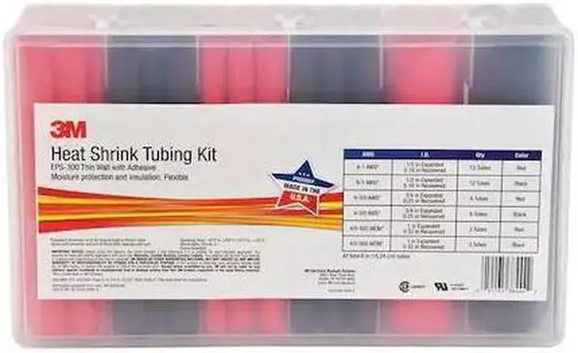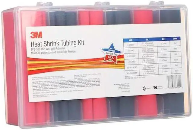 Heat Shrink Tubing Kit, Thin Wall, Material Polyolefin, Flexible, Flame Retardant No, Adhesive Lined Yes, Temp. Range -67 Degrees F to 230 Degrees F, Shrink Ratio 3:1, Number of Pieces 42, Includes (12) 3/4 in, (24) 1/2 in, (6) 1 in, Color Black, Red, Length 6 in, Shrink Tubing Properties Acid and Alkali Resistant, Package Style Sticks, Kit Contents Multiple Sizes, Use With Wire Size 6 AWG to 500 MCM, I. D. Before Shrinking 1 in, 1/2 in, 3/4 in, Dielectric Strength 700 V.