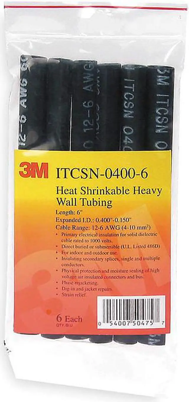 Heat Shrink Tubing, Heavy Wall, Material Cross-Linked Polyolefin with Adhesive, Rigid, Flame Retardant No, Adhesive Lined Yes, Shrink Ratio 3:1, Use With Wire Size 12 AWG to 6 AWG, I. D. Before Shrinking 0.4 in, I. D. After Shrinking 0.15 in, Wall Thickness After Shrinking 0.09 in, Length 4 ft, Shrink Tubing Properties Abrasion-Resistant, Acid and Alkali-Resistant, UV Light-Resistant, Color Black, Temp. Range -67 Degrees to 230 Degrees F, Package Style Individual Pieces. This item has been restricted from sale in the following state (s): []